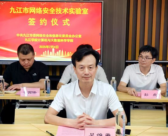 仪式上,吴维勇代表学校对市委网信办的大力支持表示衷心感谢。他强调,网络安全是国家安全的基石,是数字时代发展的生命线。学校始终将服务地方经济社会发展作为重要使命,高度重视网络安全与信息化技术人才的培养。他指出,2025年,学校成功获批“网络空间安全”本科专业并实现招生,同时该学科点已被列为学校重点建设的学术型硕士点,这标志着学校在该领域的学科建设取得了重要突破。此次与市委网信办共建“九江市网络安全技术实验室”,是学校践行服务九江市网络与信息化建设事业高质量发展使命担当的关键举措。学校将以实验室建设为契机,进一步整合资源,聚力做好网络空间安全领域的人才培养、科学研究和社会服务工作。吴维勇表示,希望市委网信办各位专家能为pp电子游戏官网网络空间安全学科建设“把脉问诊、传经送宝”,提供宝贵的指导和建议。学校将以此活动为新起点,持续深化与市委网信办的交流合作,也希望在网络安全与信息化技术联合攻关、网信人才培养输送、信息共享与应急协作机制建设等方面获得市委网信办更大力度的政策支持和资源扶助,携手为九江市的网络强市和数字九江建设贡献更大力量。