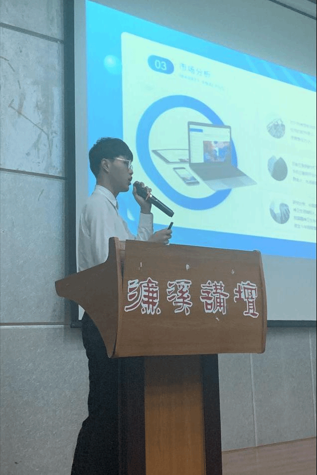 大赛共有四组选手入围,参赛的团队轮番上阵,派出的代表有秩序地上台,通过PPT现场演讲的竞演形式,全方面地阐释了各自项目创作理念、技术产品和服务概念,包括项目的灵感来源、项目策划、商业前景、市场调研、竞争优势与风险评估等。在各组选手讲解完毕后,各位评委给予充分肯定与精彩点评。最后,A2051班凭借一款治疗心理疾病的软件《治郁》获得此次比赛的第一名。