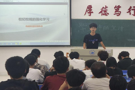 在校园文化建设的推动下,为引导广大师生深入了解学校的各项规章制度,提升学生的纪律观念和学术素养。计算机学院秉承着求真、尚美、励志、笃行的教育理念,4月17日晚于文友楼各教室开展“求真尚美,砺志笃行”学习《学习手册》主题班会。